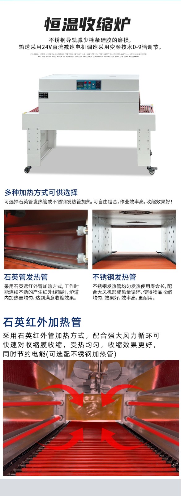 - 溫度控制精確:通常采用數(shù)顯溫控儀和進(jìn)口熱敏感應(yīng)控制,溫度可在 0-300℃范圍內(nèi)調(diào)節(jié),溫度控制精度可達(dá) ±2℃,確保熱收縮效果穩(wěn)定。