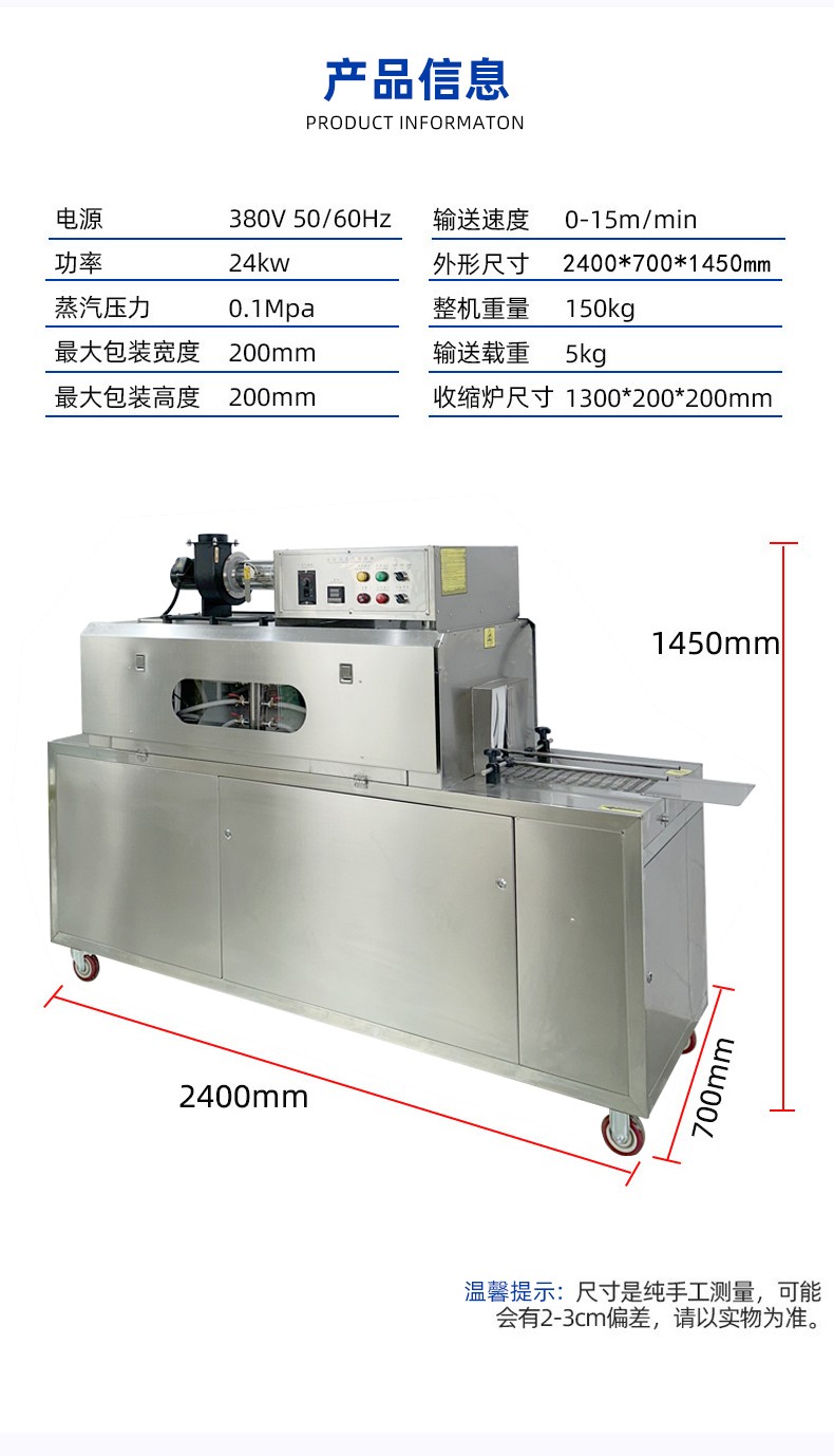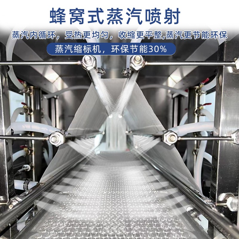 簡(jiǎn)化操作與管理流程,降低人工學(xué)習(xí)成本分體式設(shè)備需要分別操作蒸汽發(fā)生器和收縮機(jī):先啟動(dòng)發(fā)生器預(yù)熱,待蒸汽壓力達(dá)到設(shè)定值后,再開啟收縮機(jī)輸送系統(tǒng),操作過(guò)程中需頻繁往返查看兩臺(tái)設(shè)備的參數(shù),調(diào)整難度大,對(duì)操作人員的專業(yè)要求較高。蒸汽收縮一體機(jī)配備集成式智能控制面板,將蒸汽溫度、壓力、輸送速度、收縮時(shí)間等核心參數(shù)集中顯示與調(diào)控。操作人員僅需在面板上輸入產(chǎn)品包裝要求的參數(shù),設(shè)備即可自動(dòng)完成蒸汽發(fā)生、恒溫輸送、精準(zhǔn)收縮的全流程作業(yè),無(wú)需單獨(dú)管控蒸汽發(fā)生器。同時(shí),設(shè)備內(nèi)置故障自檢系統(tǒng),可實(shí)時(shí)監(jiān)測(cè)蒸汽發(fā)生模塊的運(yùn)行狀態(tài),一旦出現(xiàn)異常(如缺水、壓力不穩(wěn)),會(huì)立即發(fā)出警報(bào)并自動(dòng)停機(jī),相比分體式設(shè)備的 “雙機(jī)分別巡檢”,操作步驟減少 60% 以上,新人僅需簡(jiǎn)單培訓(xùn)即可上崗,有效降低人工管理成本與操作失誤率。