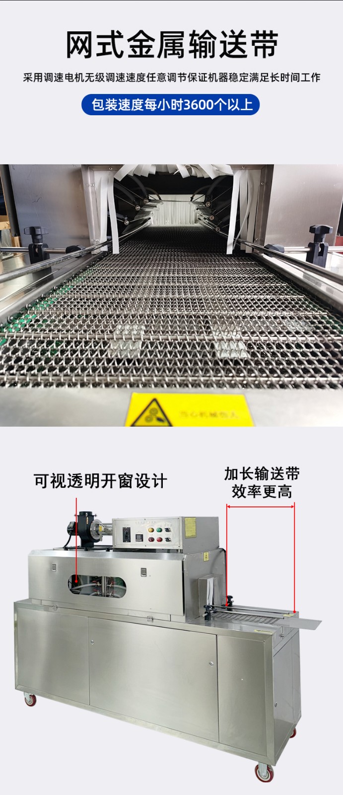 - 輸送系統(tǒng):用于將待包裝的產(chǎn)品輸送到蒸汽收縮區(qū)域,常見的有輸送帶、輸送鏈條等,材質(zhì)多為不銹鋼或其他耐高溫、耐腐蝕材料。