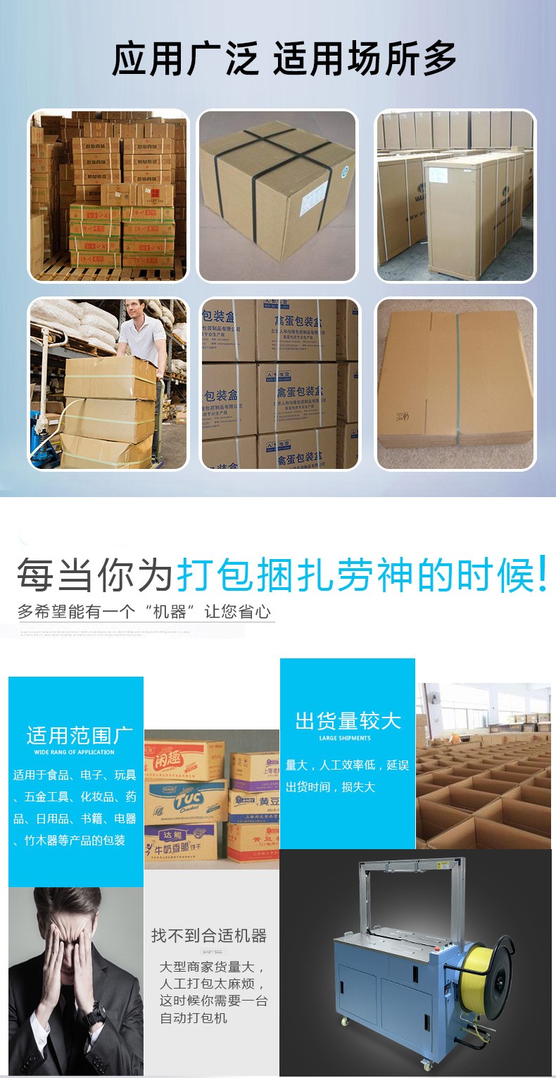 - 半自動打包機:適用于小型工廠、商店、快遞公司網(wǎng)點、辦公室等,這些地方打包量相對較小,使用半自動打包機既能滿足打包需求,又能在設(shè)備成本和人工成本之間取得較好的平衡