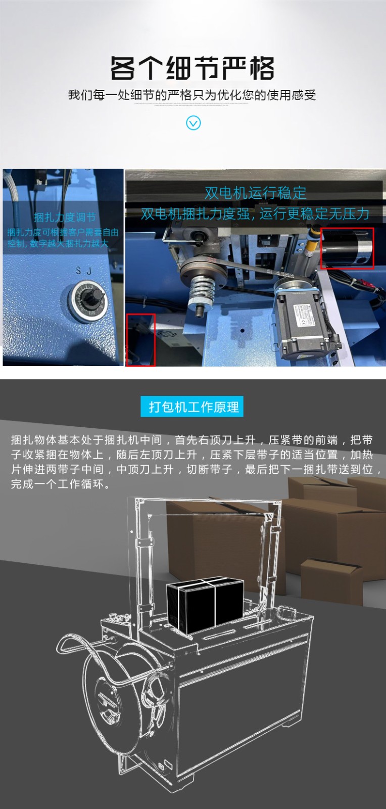- 全自動打包機:自動化程度高,能自動完成送帶、捆扎、收緊、封口、切斷等一系列打包流程,只需將物品放置在指定位置,按下啟動按鈕,機器就會按照預設(shè)程序完成整個打包過程,無需人工干預每個步驟。