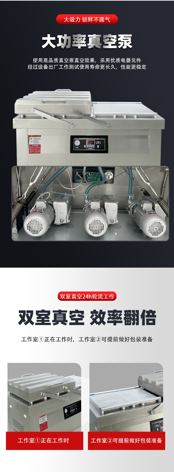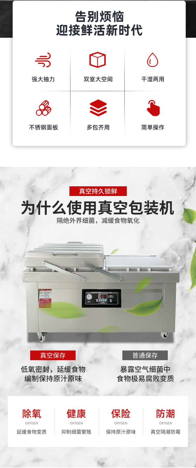 雙室真空包裝機(jī)通過(guò) “雙真空室輪換作業(yè)” 實(shí)現(xiàn)抽真空與裝袋無(wú)縫銜接,核心是利用兩個(gè)獨(dú)立真空室的 “時(shí)間差并行操作”,讓設(shè)備在同一周期內(nèi)同時(shí)完成 “抽真空密封” 和 “人工 / 自動(dòng)裝袋”,徹底消除單室機(jī)型 “抽真空時(shí)無(wú)法裝袋” 的等待間隙,大幅提升作業(yè)效率。其具體運(yùn)作邏輯和優(yōu)勢(shì)可拆解為以下 3 點(diǎn):