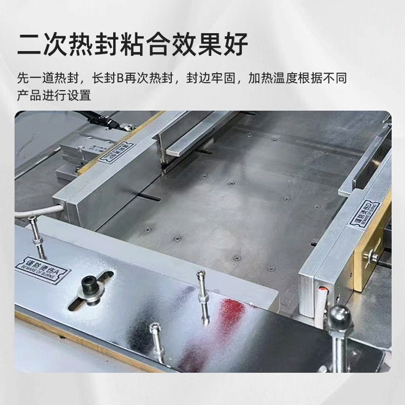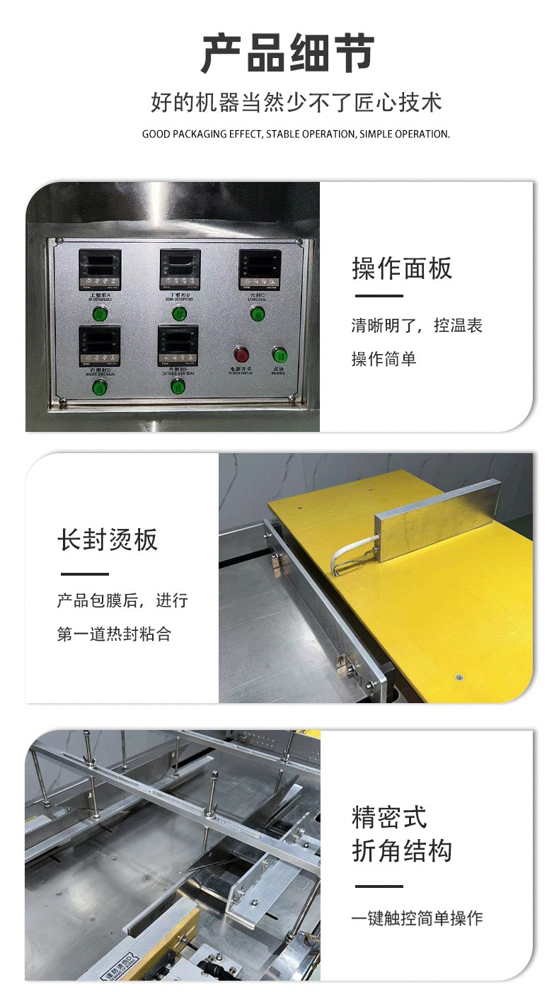 - 折邊定型:封切后的產(chǎn)品進入折邊工位,預熱裝置先對產(chǎn)品兩端的多余膜料進行軟化(便于塑形),再通過機械折邊機構(側折板、端折板)將膜料折疊、壓合,使包裝邊緣平整緊致,最終形成與產(chǎn)品形狀完全匹配的立體包裝;