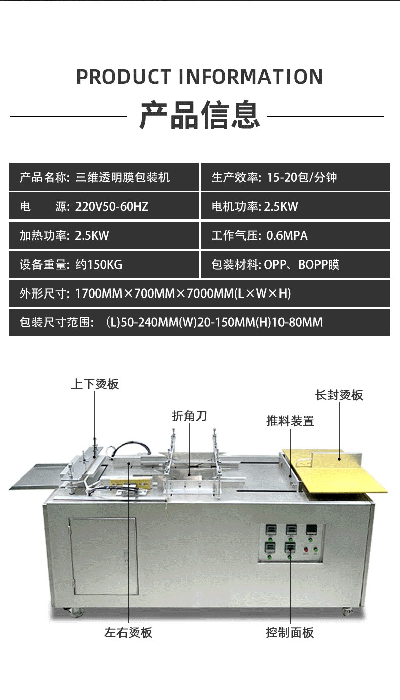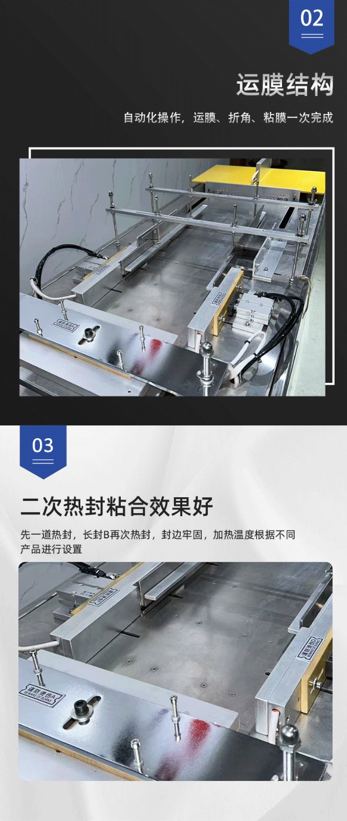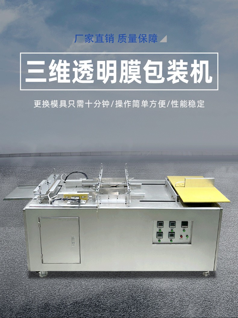 設備通過 “膜料預處理→人工上料定位→三維裹膜成型→熱封切邊→折邊定型→成品輸出” 的流程,實現(xiàn)產(chǎn)品的立體包裝,具體步驟拆解如下: